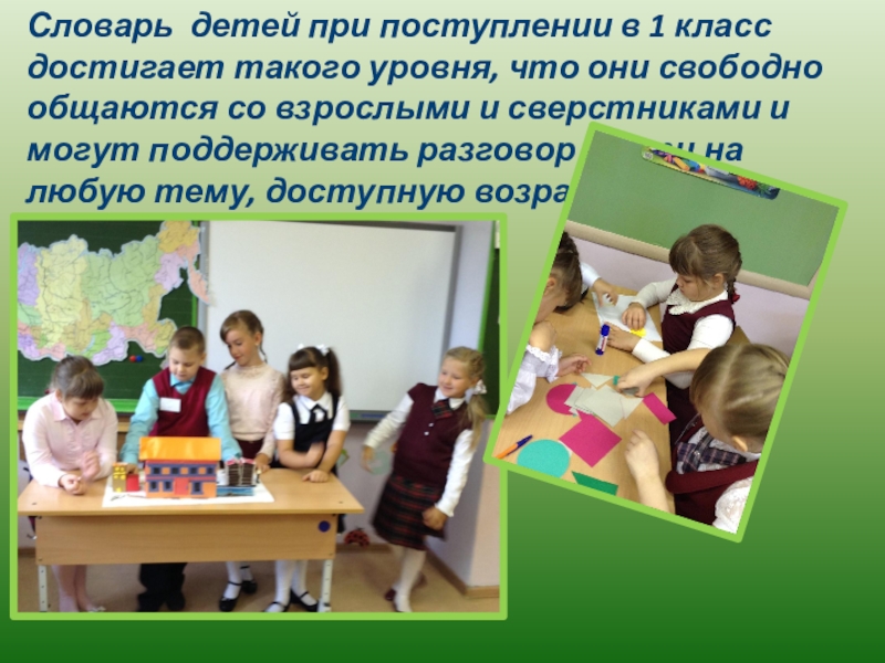 Слайд 2Словарь детей при поступлении в 1 класс достигает такого уровня, что
