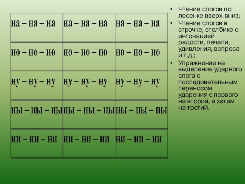 Слайд 14Чтение слогов по лесенке вверх-вниз;