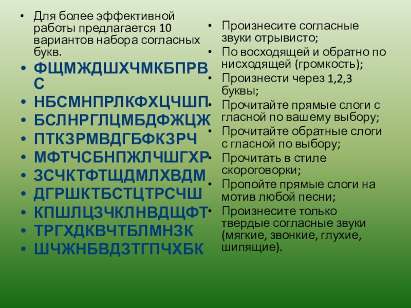Слайд 13Для более эффективной работы предлагается 10 вариантов набора согласных букв.
