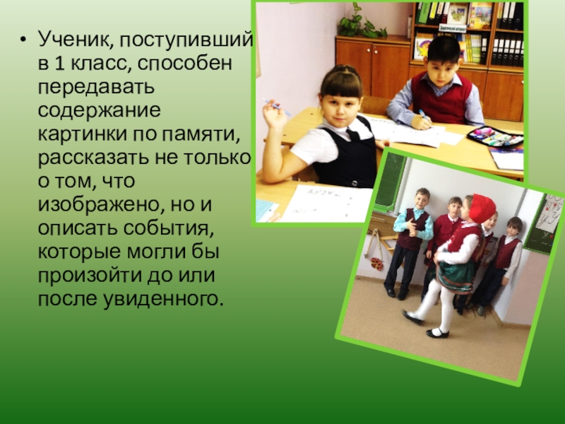 Слайд 10Ученик, поступивший в 1 класс, способен передавать содержание картинки по памяти,