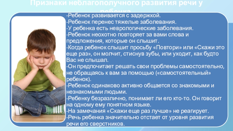Слайд 3Признаки неблагополучного развития речи у ребенка.