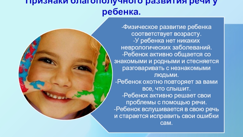 Слайд 2Признаки благополучного развития речи у ребенка.