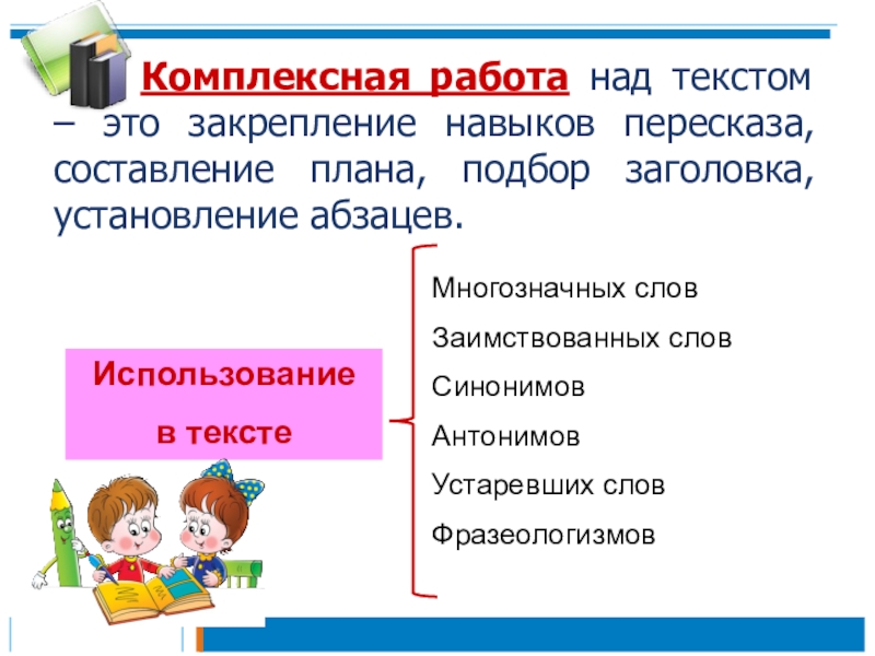 различные виды пересказа, изложений, сочинений, усложняющие процесс конструирования текста.