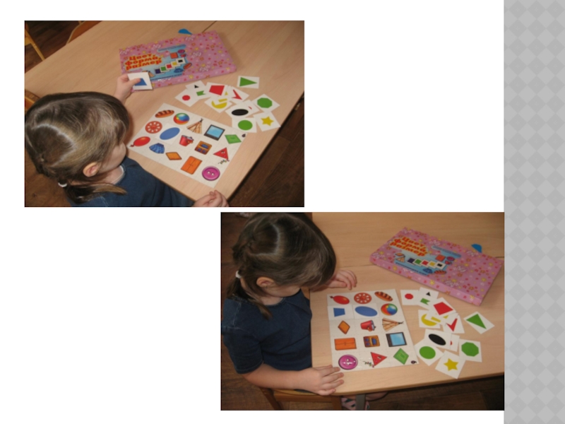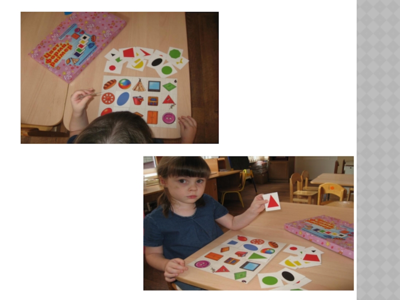 детей сравнивать геометрическую фигуру и подбирать к предмету.