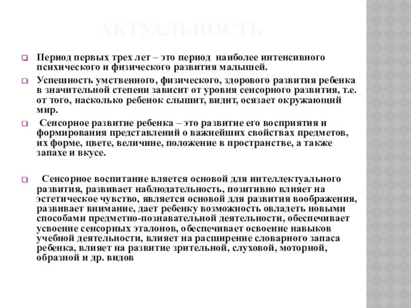 Успешность умственного, физического, здорового развития ребенка в значительной степени зависит от уровня сенсорного развития, т.е. от того, насколько ребенок слышит, видит, осязает окружающий мир.