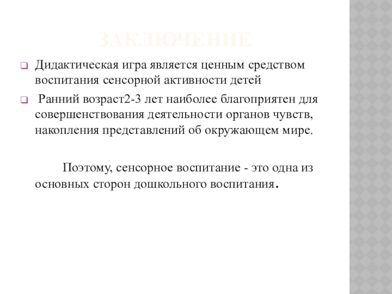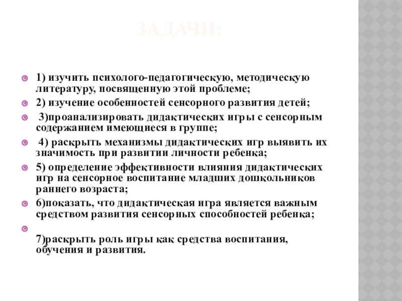 6)показать, что дидактическая игра является важным средством развития сенсорных способностей ребенка;
