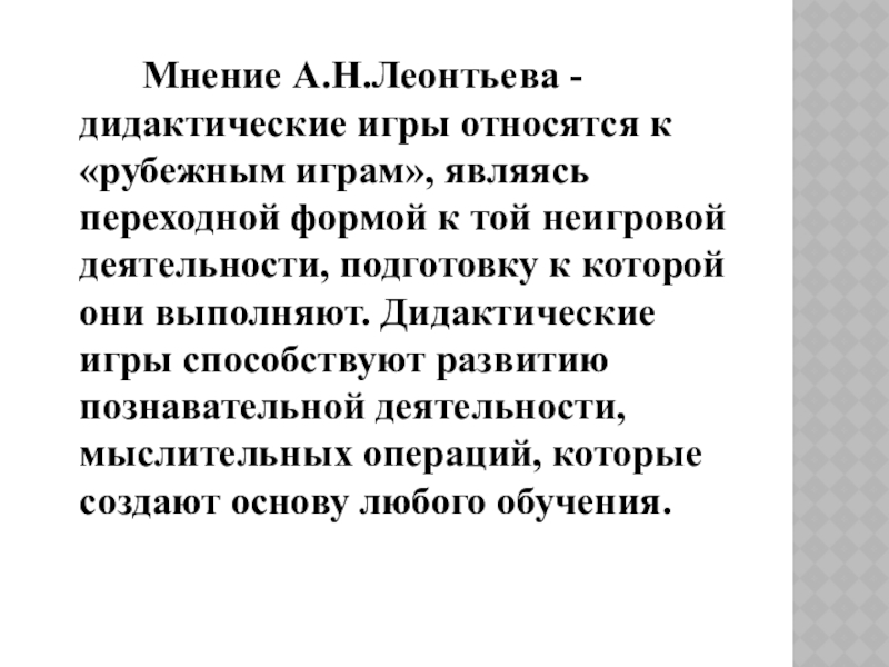 Слайд 3 Мнение А.Н.Леонтьева - дидактические игры относятся к «рубежным играм», являясь переходной