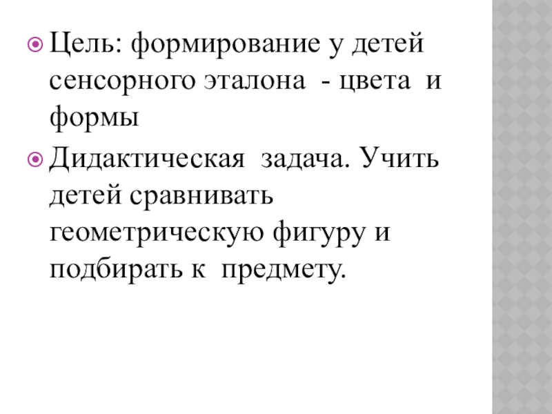 Слайд 24Цель: формирование у детей сенсорного эталона - цвета и формы