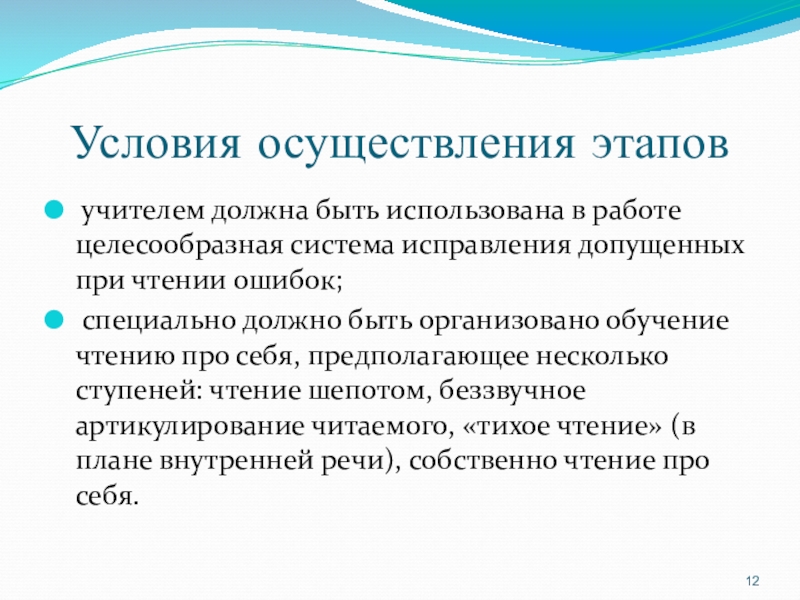 специально должно быть организовано обучение чтению про себя, предполагающее несколько ступеней: чтение шепотом, беззвучное артикулирование читаемого, «тихое чтение» (в плане внутренней речи), собственно чтение про себя.