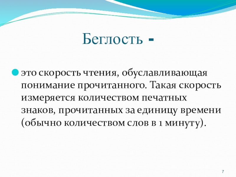 количеством печатных знаков, прочитанных за единицу времени (обычно количеством слов в 1 минуту).