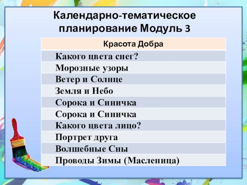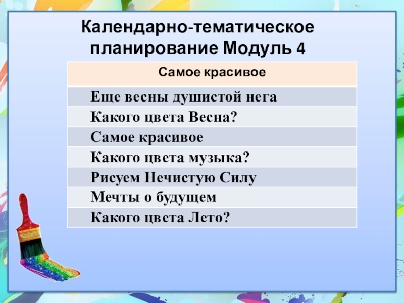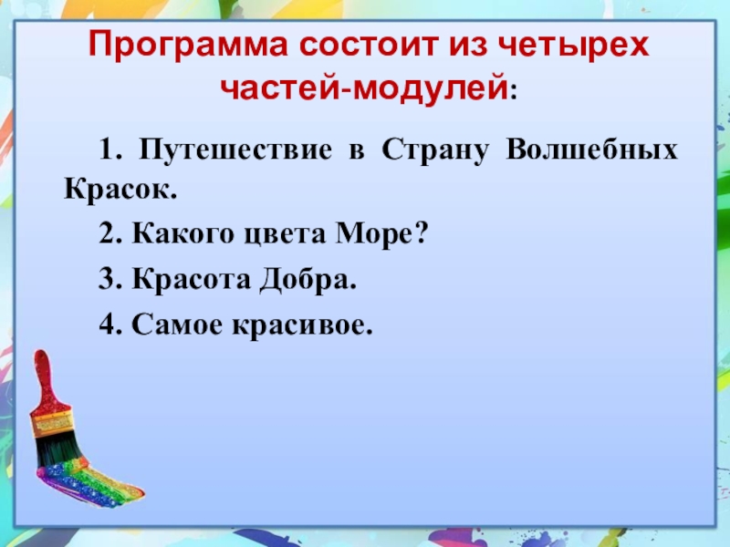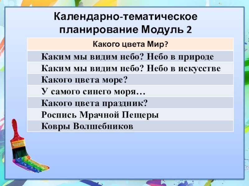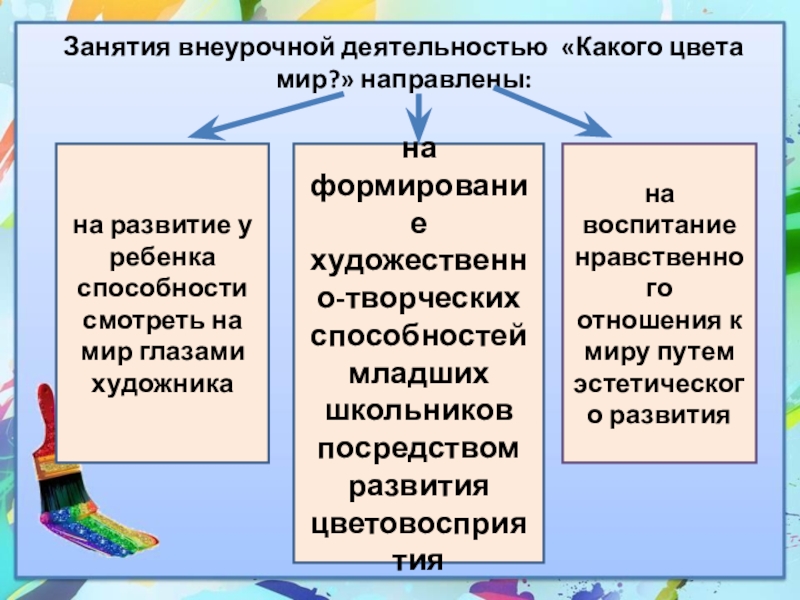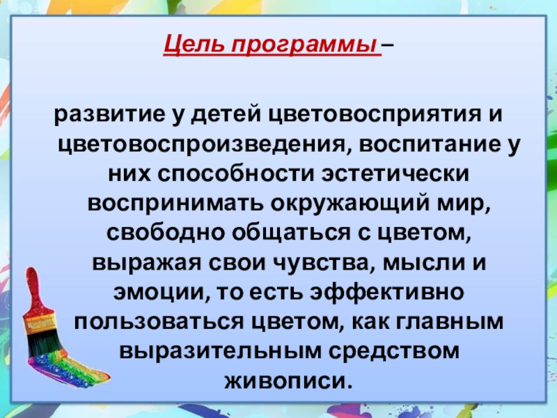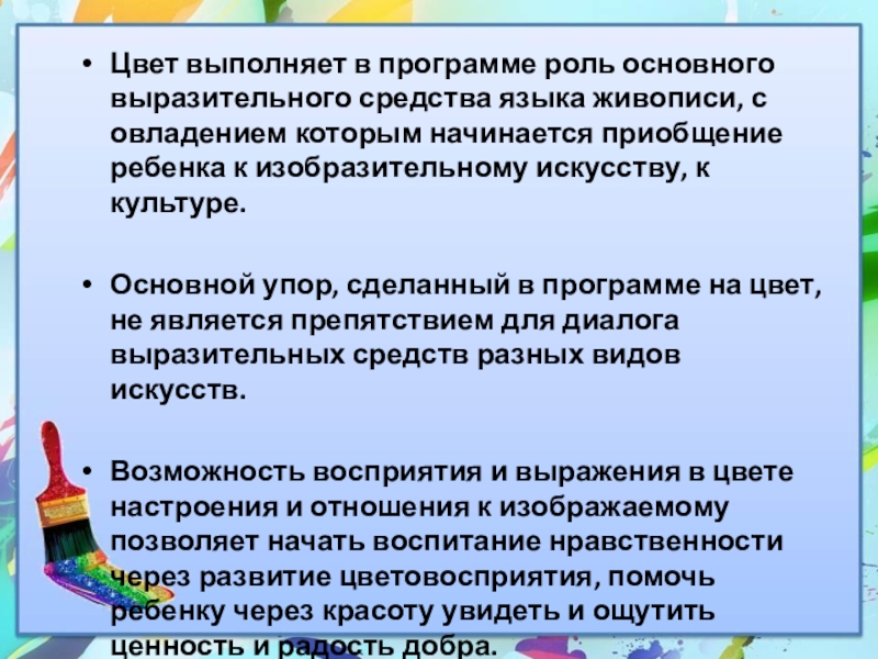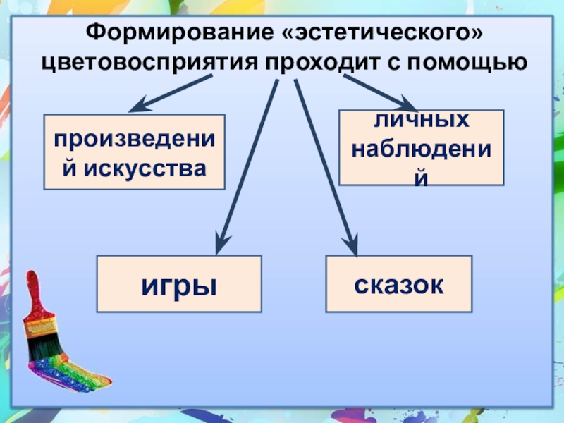 2) Открытие связи цвета с настроением, а также символической роли цвета в искусстве, осмысленное восприятие цвета в живописи; творческое использование цвета с целью выражения настроения и личного отношения к героям сказок в рисунках.