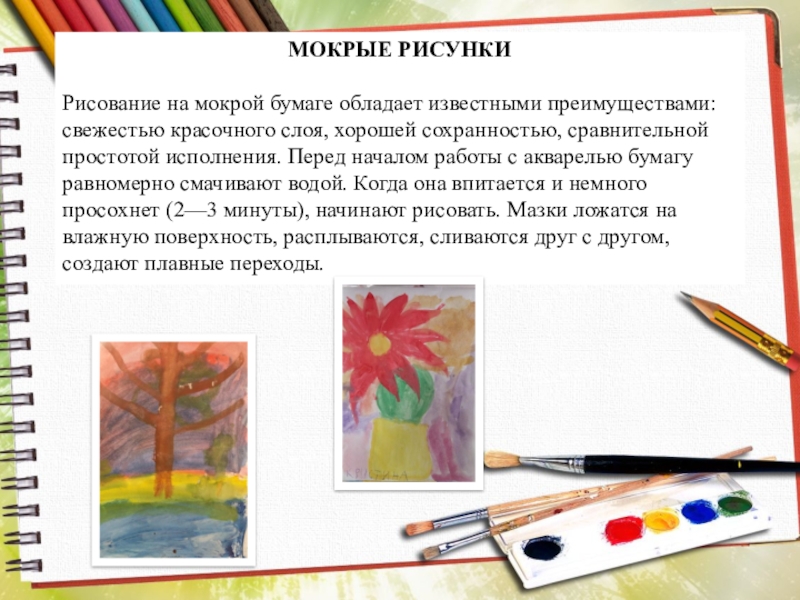 хорошей сохранностью, сравнительной простотой исполнения. Перед началом работы с акварелью бумагу равномерно смачивают водой. Когда она впитается и немного просохнет (2—3 минуты), начинают рисовать. Мазки ложатся на влажную поверхность, расплываются, сливаются друг с другом, создают плавные переходы.