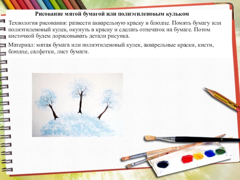 Слайд 14Рисование мятой бумагой или полиэтиленовым кульком