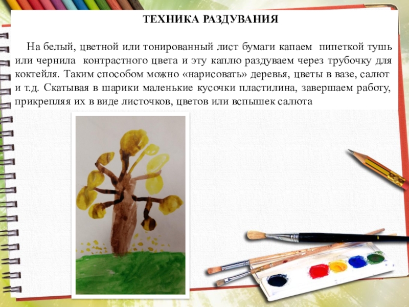 или чернила контрастного цвета и эту каплю раздуваем через трубочку для коктейля. Таким способом можно «нарисовать» деревья, цветы в вазе, салют и т.д. Скатывая в шарики маленькие кусочки пластилина, завершаем работу, прикрепляя их в виде листочков, цветов или вспышек салюта