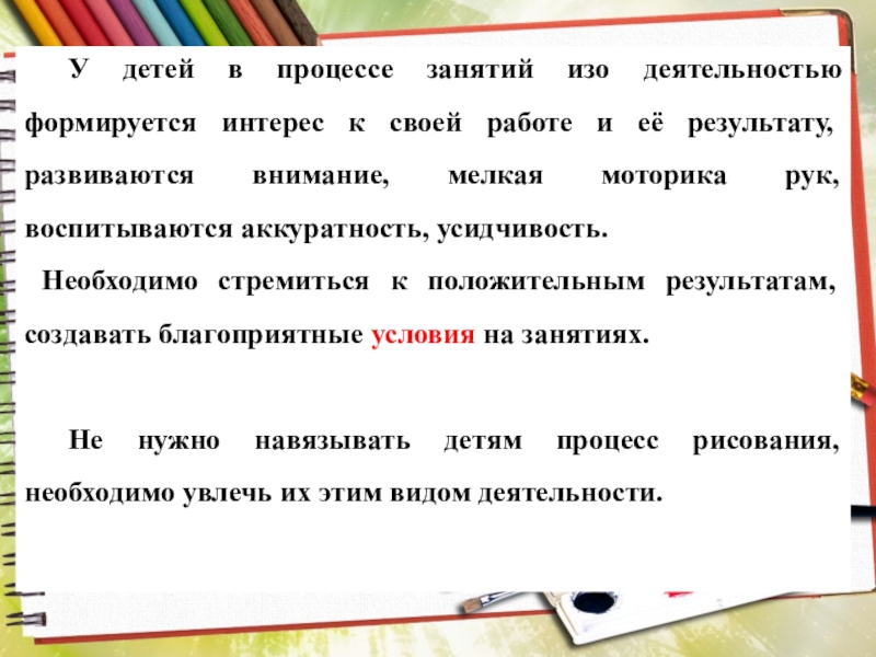 Слайд 18 У детей в процессе занятий изо деятельностью формируется интерес к своей