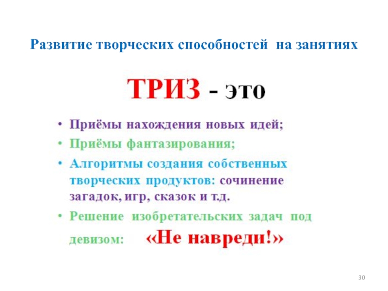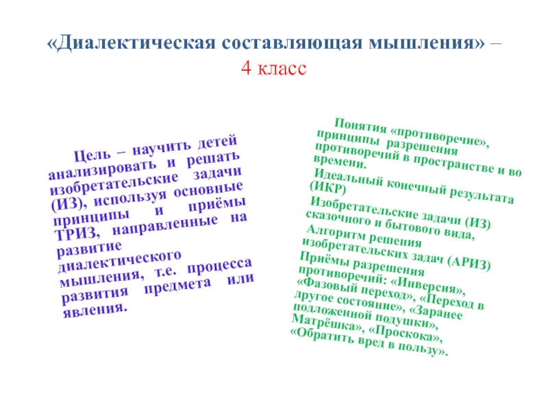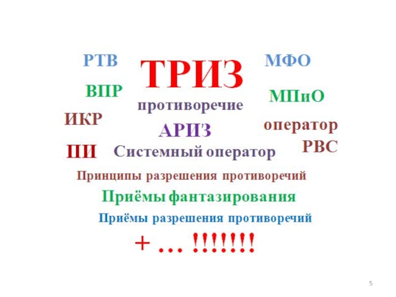 Приёмы разрешения противоречий: «Инверсия», «Фазовый переход», «Переход в другое состояние», «Заранее подложенной подушки», Матрёшка», «Проскока», «Обратить вред в пользу».