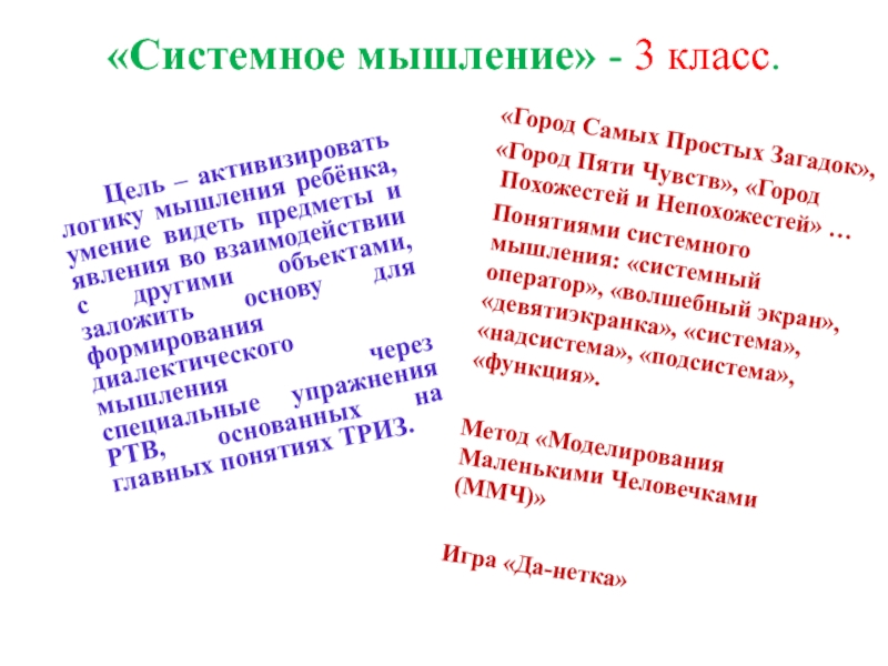 Понятиями системного мышления: «системный оператор», «волшебный экран», «девятиэкранка», «система», «надсистема», «подсистема», «функция».