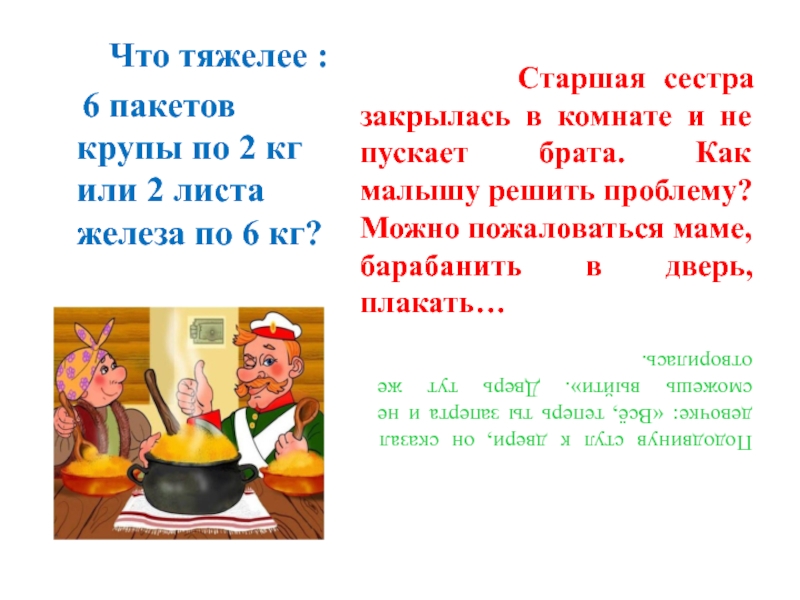6 пакетов крупы по 2 кг или 2 листа железа по 6 кг?