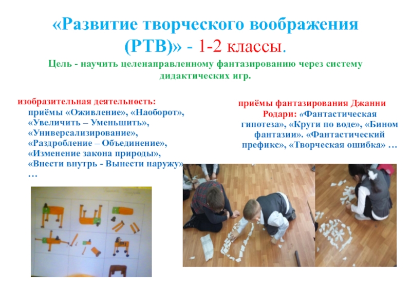 изобразительная деятельность: приёмы «Оживление», «Наоборот», «Увеличить – Уменьшить», «Универсализирование», «Раздробление – Объединение», «Изменение закона природы», «Внести внутрь - Вынести наружу»…