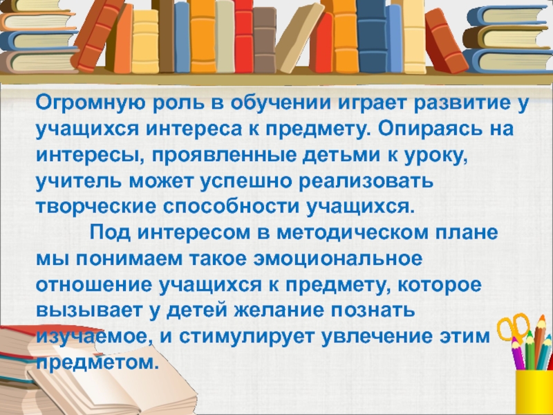 Слайд 5Огромную роль в обучении играет развитие у учащихся интереса к предмету.