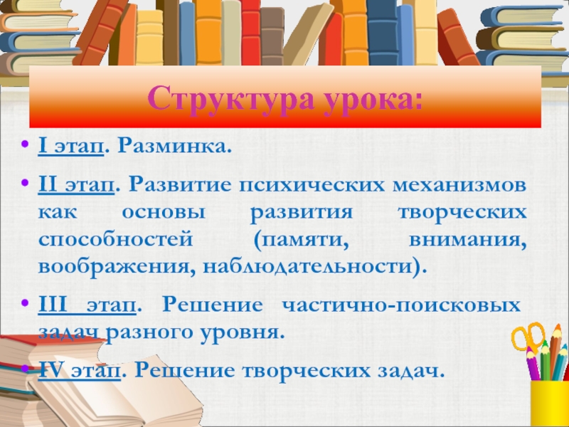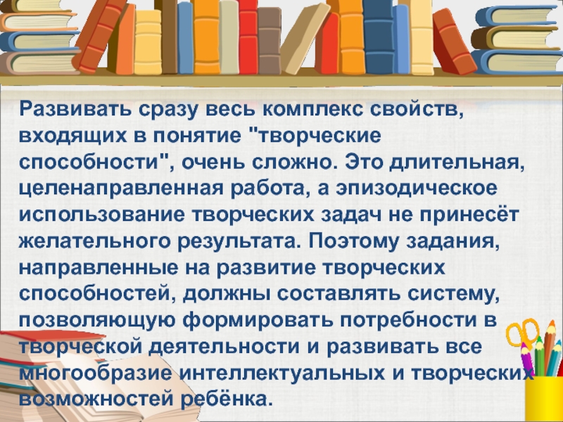 сложно. Это длительная, целенаправленная работа, а эпизодическое использование творческих задач не принесёт желательного результата. Поэтому задания, направленные на развитие творческих способностей, должны составлять систему, позволяющую формировать потребности в творческой деятельности и развивать все многообразие интеллектуальных и творческих возможностей ребёнка.