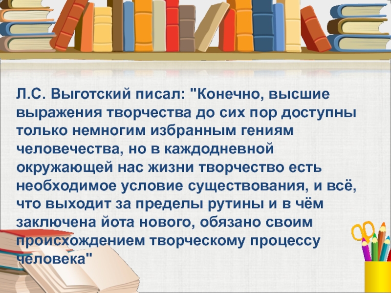 Слайд 21Л.С. Выготский писал: "Конечно, высшие выражения творчества до сих пор доступны