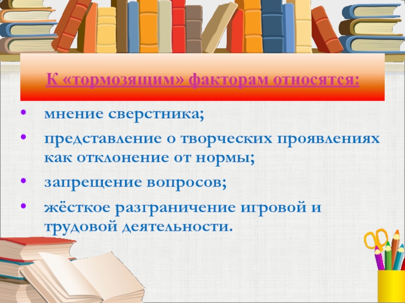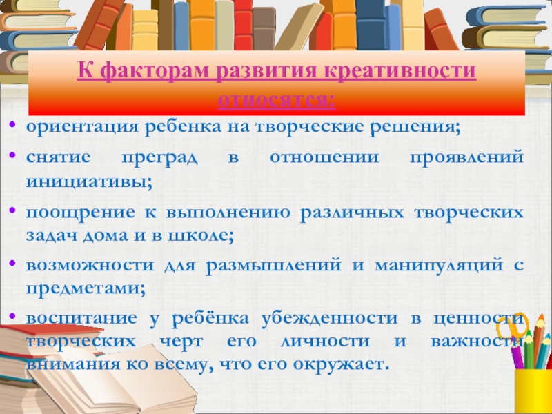 Слайд 8К факторам развития креативности относятся: