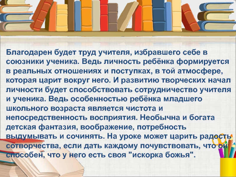 ребёнка формируется в реальных отношениях и поступках, в той атмосфере, которая царит вокруг него. И развитию творческих начал личности будет способствовать сотрудничество учителя и ученика. Ведь особенностью ребёнка младшего школьного возраста является чистота и непосредственность восприятия. Необычна и богата детская фантазия, воображение, потребность выдумывать и сочинять. На уроке может царить радость сотворчества, если дать каждому почувствовать, что он способен, что у него есть своя "искорка божья".