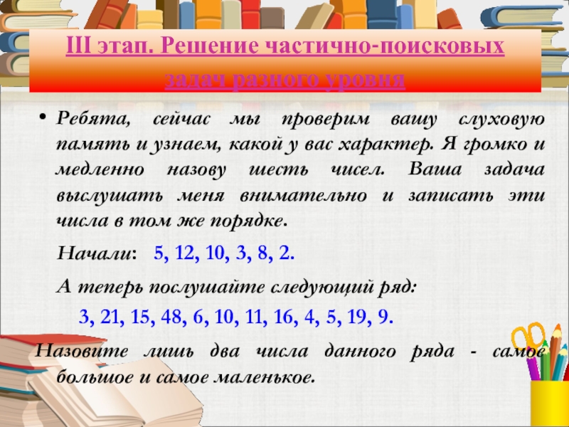Слайд 15III этап. Решение частично-поисковых задач разного уровня