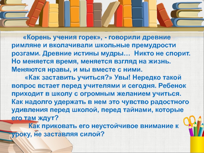 Слайд 4 «Корень учения горек», - говорили древние римляне и вколачивали школьные