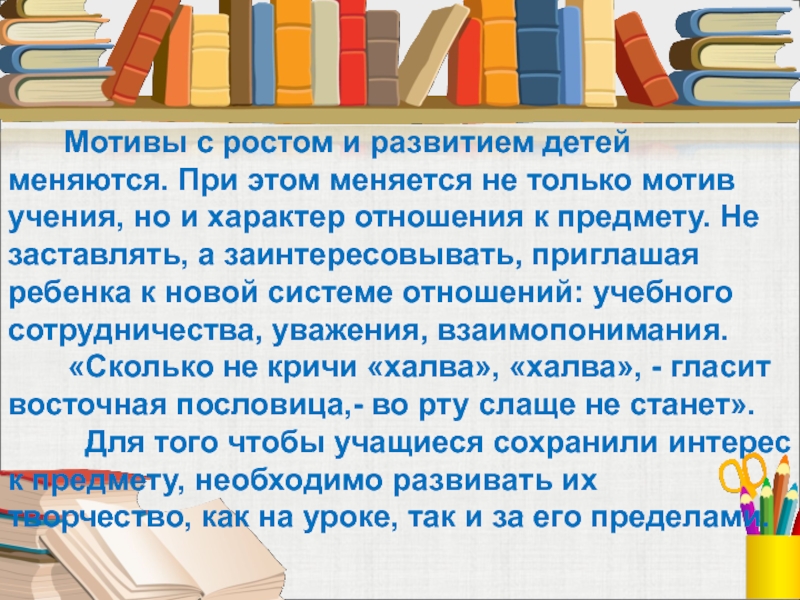 Слайд 6 Мотивы с ростом и развитием детей меняются. При этом меняется