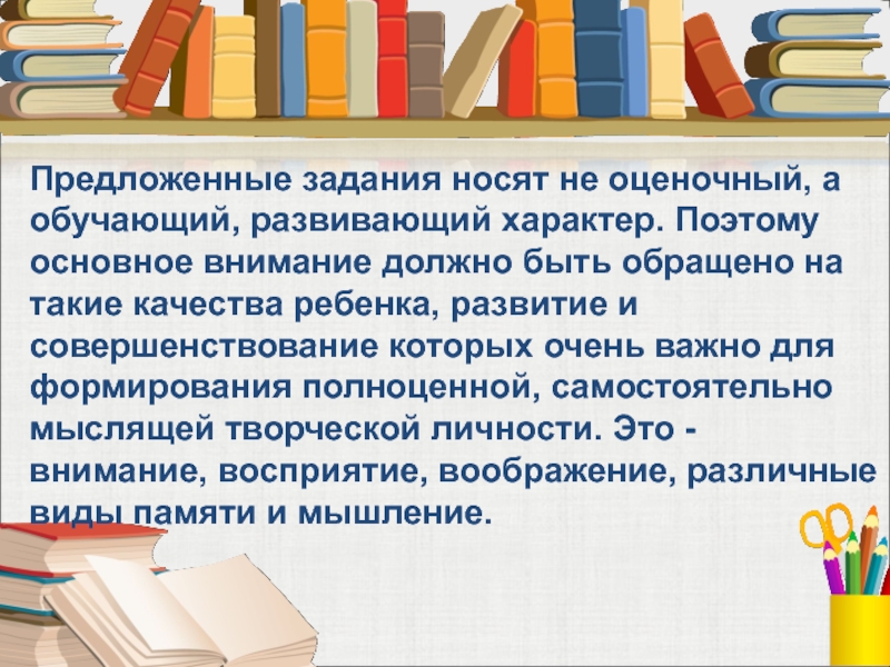 Слайд 20Предложенные задания носят не оценочный, а обучающий, развивающий характер. Поэтому основное