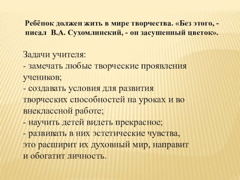 - развивать в них эстетические чувства, это расширит их духовный мир, направит и обогатит личность.