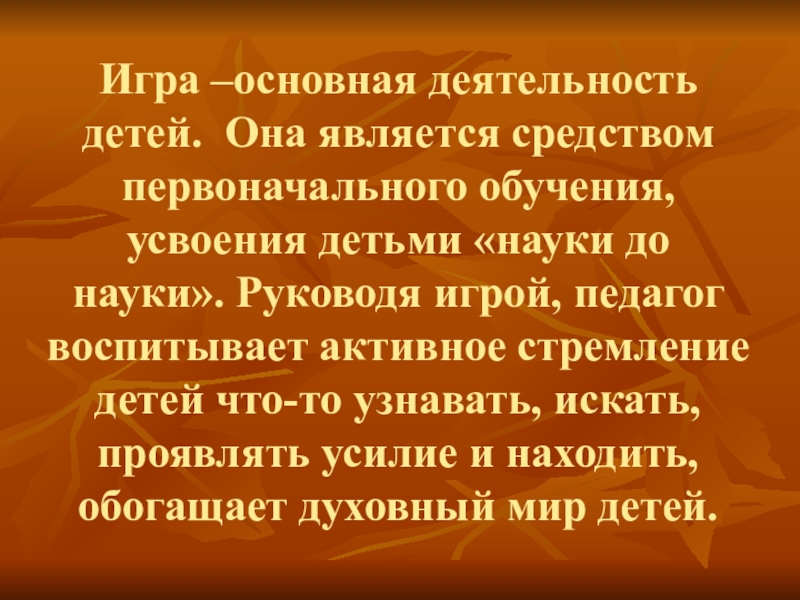 «науки до науки». Руководя игрой, педагог воспитывает активное стремление детей что-то узнавать, искать, проявлять усилие и находить, обогащает духовный мир детей.