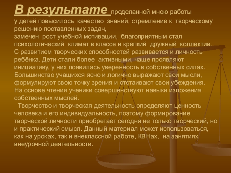 замечен рост учебной мотивации, благоприятным стал психологический климат в классе и крепкий дружный коллектив. С развитием творческих способностей развивается и личность ребёнка. Дети стали более активными, чаще проявляют инициативу, у них появилась уверенность в собственных силах. Большинство учащихся ясно и логично выражают свои мысли, формулируют свою точку зрения и отстаивают свои убеждения.