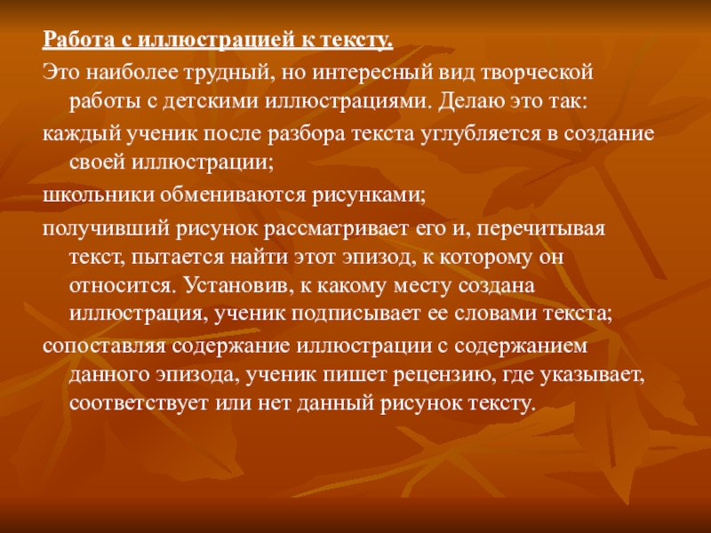 получивший рисунок рассматривает его и, перечитывая текст, пытается найти этот эпизод, к которому он относится. Установив, к какому месту создана иллюстрация, ученик подписывает ее словами текста;