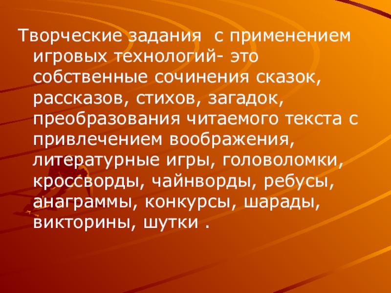Слайд 10Творческие задания с применением игровых технологий- это собственные сочинения сказок, рассказов,
