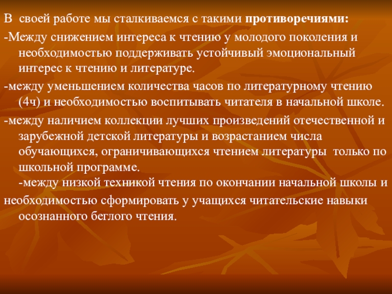 -между уменьшением количества часов по литературному чтению (4ч) и необходимостью воспитывать читателя в начальной школе.