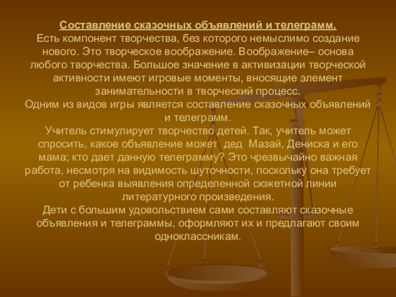 Одним из видов игры является составление сказочных объявлений и телеграмм.