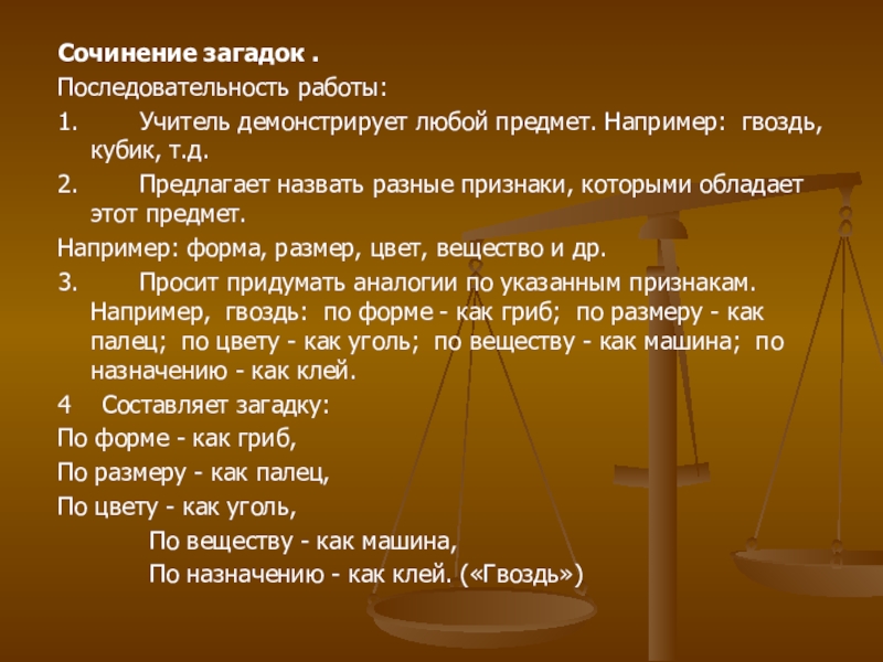 3. Просит придумать аналогии по указанным признакам. Например, гвоздь: по форме - как гриб; по размеру - как палец; по цвету - как уголь; по веществу - как машина; по назначению - как клей.