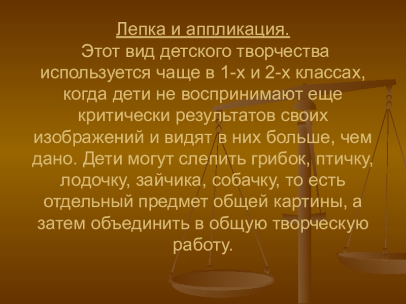 и 2-х классах, когда дети не воспринимают еще критически результатов своих изображений и видят в них больше, чем дано. Дети могут слепить грибок, птичку, лодочку, зайчика, собачку, то есть отдельный предмет общей картины, а затем объединить в общую творческую работу.