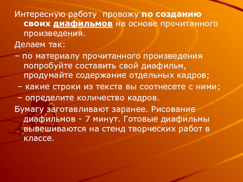 – по материалу прочитанного произведения попробуйте составить свой диафильм, продумайте содержание отдельных кадров;