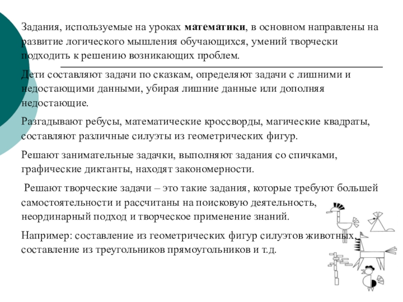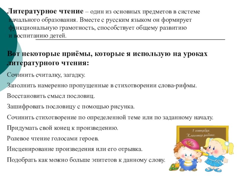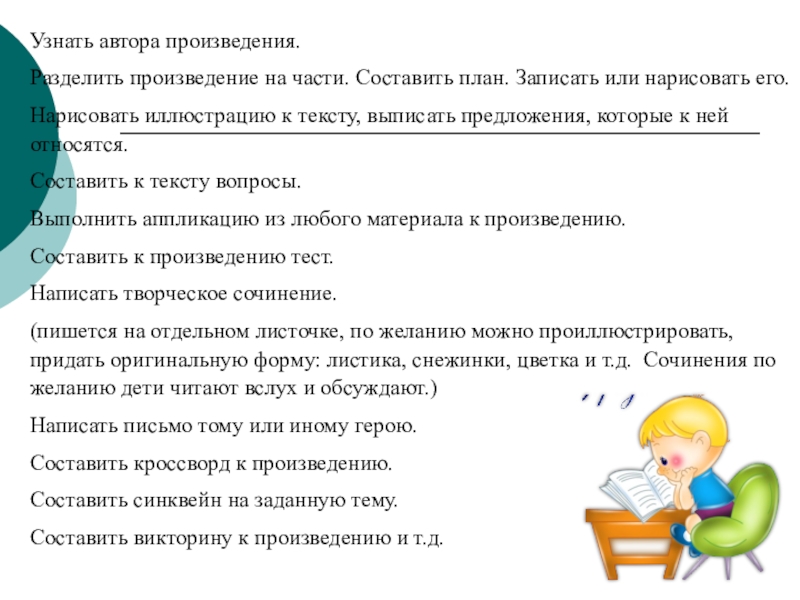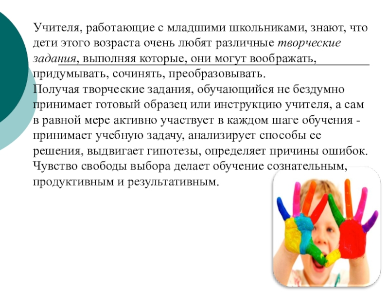 Сочинения творческого характера формируют потребность в самовыражении, сопереживании. Ребёнок должен проявить умение сравнивать, доказывать, найти выразительные средства – т.е. выполнить работу творчески. Различные темы творческих сочинений позволяет сделать работу интересной, разнообразной.