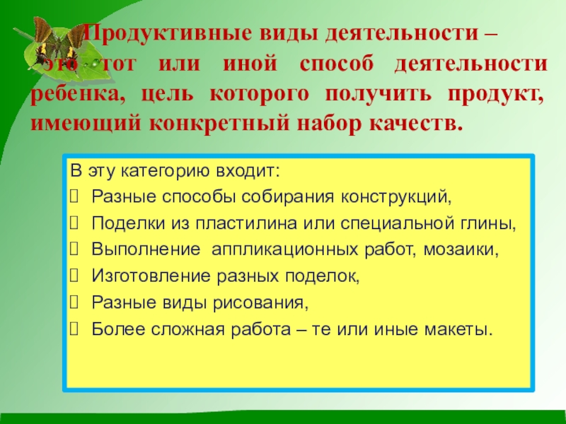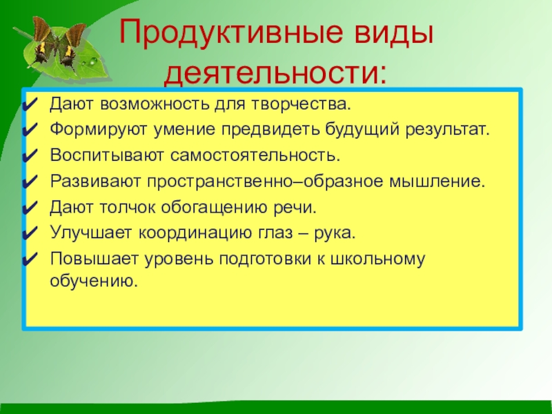 В процессе продуктивной деятельности сочетается умственная и физическая активность, для создания рисунка, лепки, аппликации необходимо совершать трудовые действия, овладеть определенными умениями.