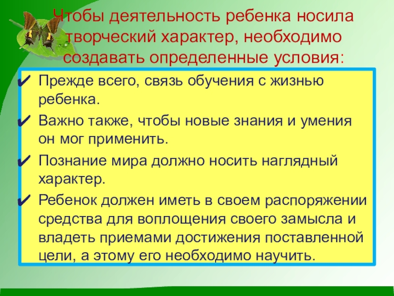 Слайд 10Чтобы деятельность ребенка носила творческий характер, необходимо создавать определенные условия: