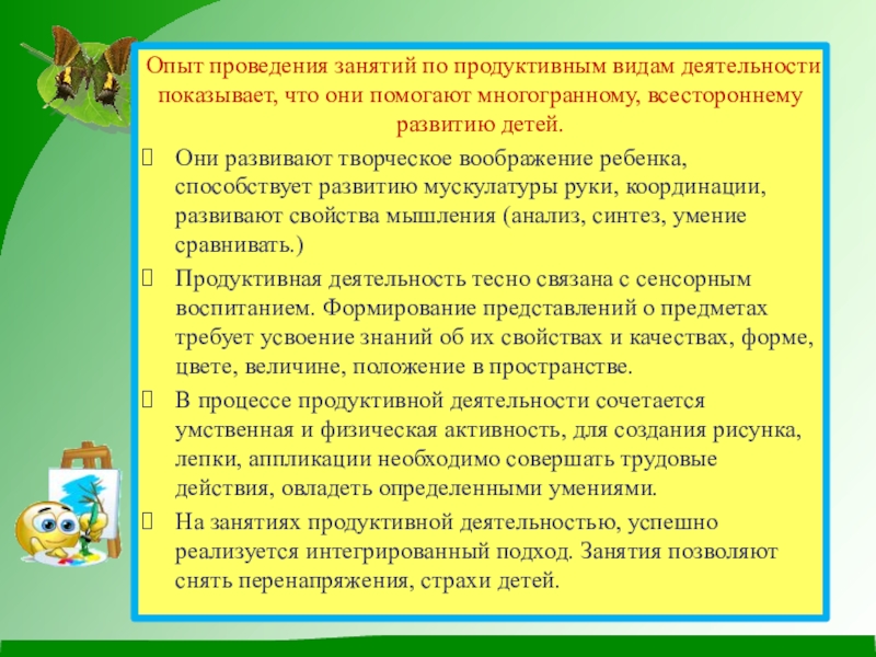 Слайд 22Опыт проведения занятий по продуктивным видам деятельности показывает, что они помогают