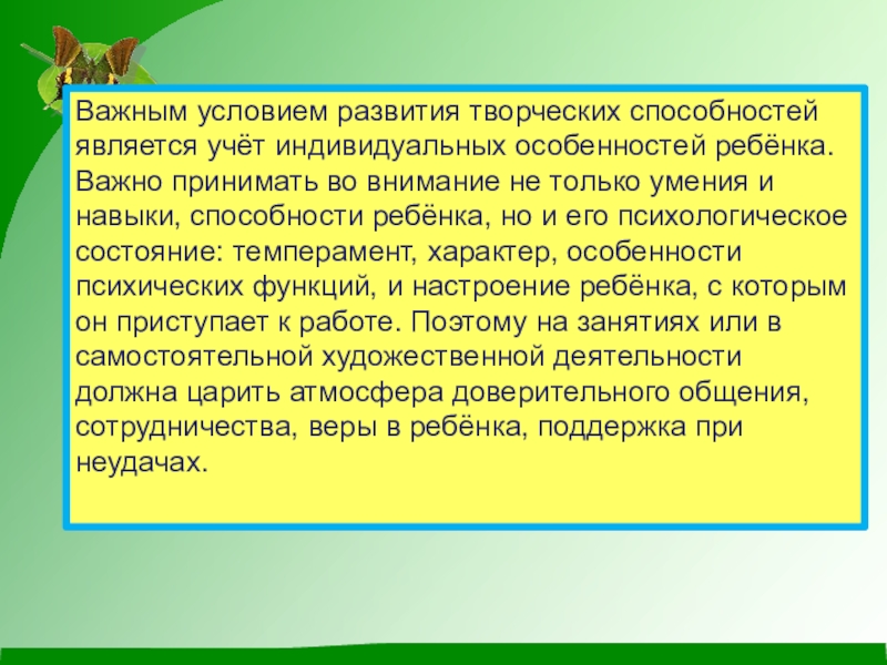 Слайд 7Важным условием развития творческих способностей является учёт индивидуальных особенностей ребёнка. Важно