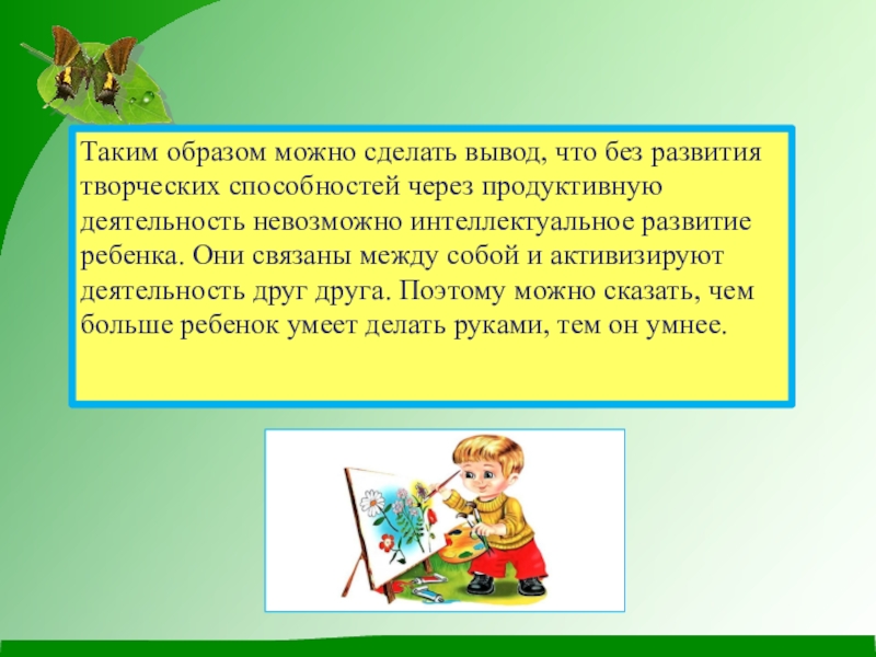 продуктивную деятельность невозможно интеллектуальное развитие ребенка. Они связаны между собой и активизируют деятельность друг друга. Поэтому можно сказать, чем больше ребенок умеет делать руками, тем он умнее.