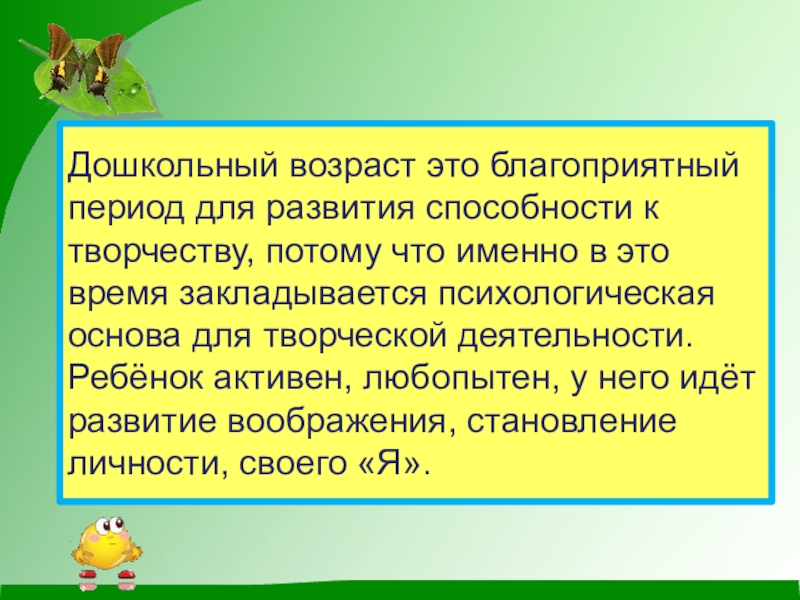 Слайд 5Дошкольный возраст это благоприятный период для развития способности к творчеству, потому