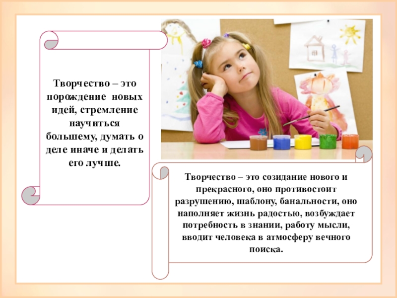 Творчество – это созидание нового и прекрасного, оно противостоит разрушению, шаблону, банальности, оно наполняет жизнь радостью, возбуждает потребность в знании, работу мысли, вводит человека в атмосферу вечного поиска.